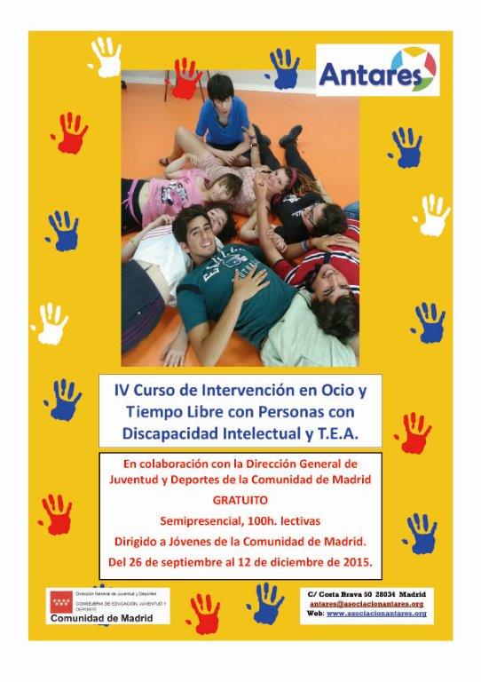 El próximo sábado, a las 10:00h., dará comienzo la IV Edición del curso de Intervención Antares. Una formación semipresencial destinada a todas aquellas personas de entre 18 y 30 años, de la Comunidad de Madrid, interesadas en acercarse de manera positiva al colectivo de personas con discapacidad intelectual y a su desarrollo, a través del ocio y tiempo libre.
