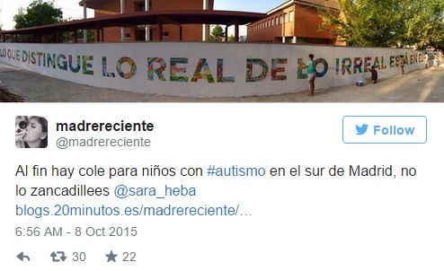 Me quiero sumar y apoyar a esta madre, pues trabajo en Getafe, tb soy madre de un niño con espectro autista, me indigna que esta reciente alcadesa despache con «viento fresco» a esta madre y otras que desde mi puesto de trabajo he podido escuchar como tenían en este centro puestas sus máximas ilusiones.Por eso, animo a tod@s los que estén interesados, que desde Autismo Madrid, puedan realizar un documento para recoger firmas y presentarlas en el Ayuntamiento de Getafe y en la consejería de Educación para manifestar este agravio y que no nos manden a un Centro de Educación Especial público que ya está el centro AUCAVI para dar respuesta a esta demanda educativa. Pues existe un artículo «que defiende la libertad de los padres a educar a sus hijos en el centro que ellos quieran no lo que diga una Alcaldesa».