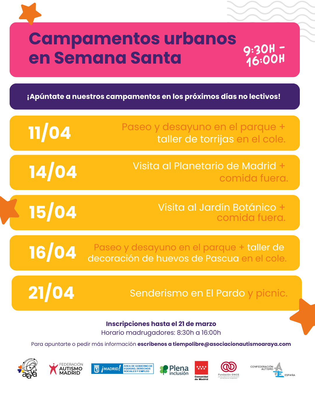 Para inscripciones, o solicitud de más información, envía un correo a: tiempolibre@asociacionautismoaraya.org