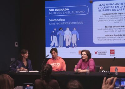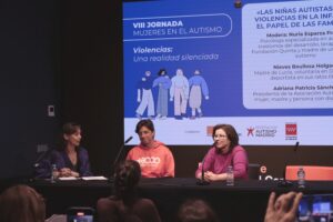 La segunda mesa, «Las niñas autistas y las violencias en la infancia: el papel de las familias», fue moderada por Nuria Esparza Franco, psicóloga especializada en autismo y trastornos del desarrollo, terapeuta en Fundación Quinta y madre de una niña con autismo. Junto a ella participaron Nieves Boullosa Holgado y Adriana Patricia Sánchez, quienes abordaron las múltiples barreras que enfrentan sus hijas en el acceso a recursos y destacaron la necesidad de apoyo para las familias, que a menudo deben sortear obstáculos adicionales para acceder a orientación y a servicios que se adapten a las necesidades reales.