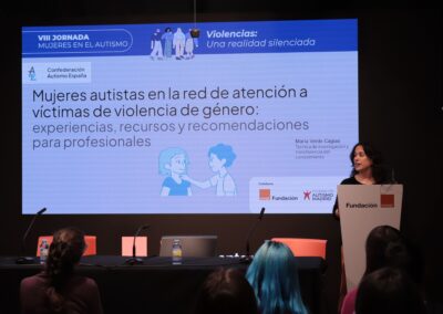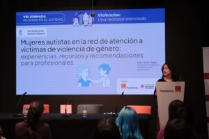 Para cerrar la jornada, María Verde Cagiao, psicóloga y técnica de investigación del área de investigación de la Confederación Autismo España, impartió la ponencia «Mujeres autistas en la red de atención a víctimas de violencia de género: experiencias, recursos y recomendaciones para profesionales». En su intervención, destacó la escasez de recursos especializados en autismo y violencia de género y las barreras que dificultan el acceso de las mujeres autistas a una protección y un apoyo adecuados.