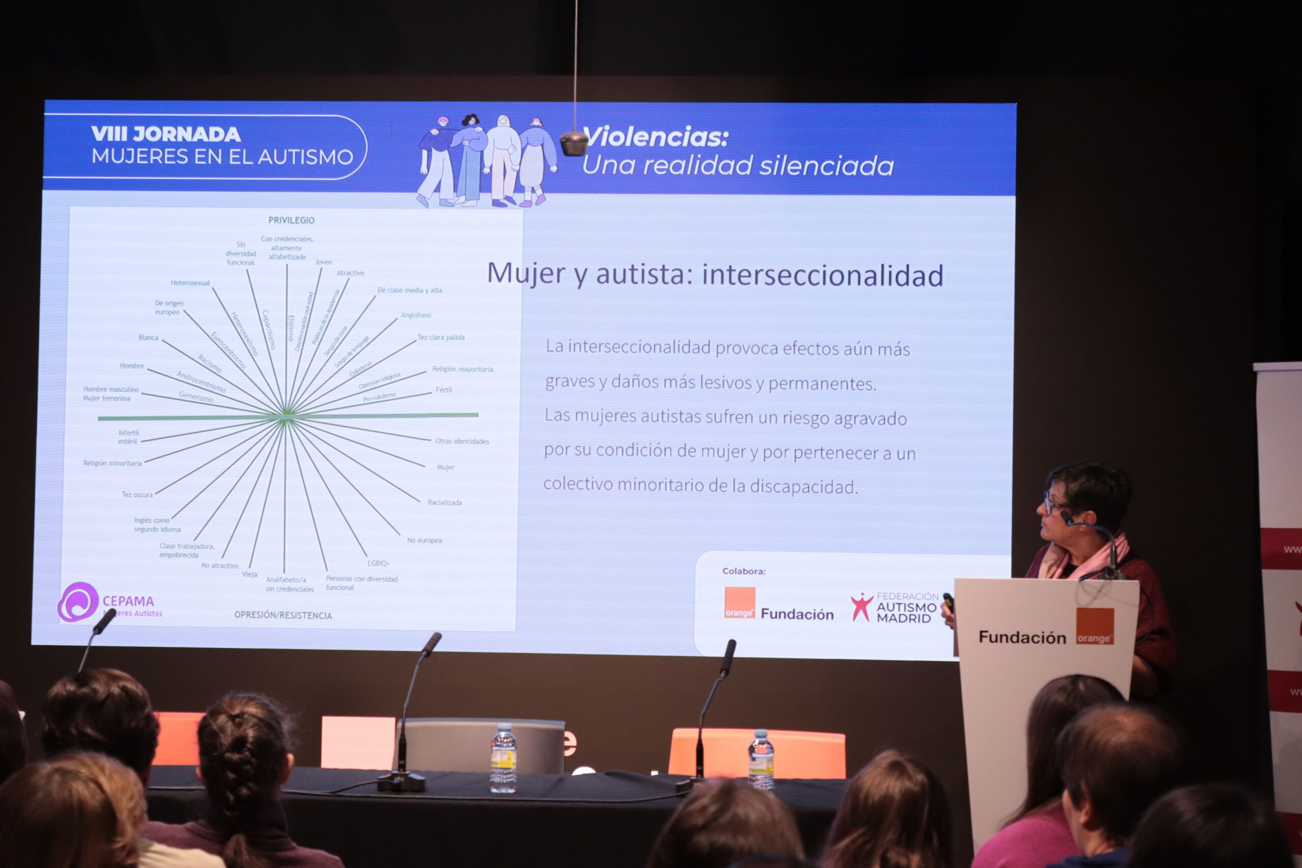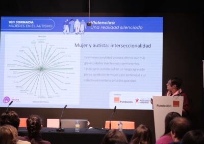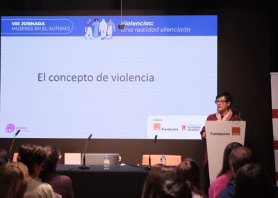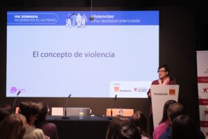 Carmen Molina, presidenta de la Asociación CEPAMA Mujeres Autistas, contextualizó el concepto de violencia y expuso los distintos tipos de violencia que afectan a las mujeres autistas: institucional, intrafamiliar, en entornos educativos y laborales, así como en el ámbito digital. Desde una perspectiva interseccional, destacó cómo el riesgo se agrava no solo por la condición de mujer, sino también por pertenecer a un colectivo minoritario dentro de la discapacidad. Se subrayó, además, la mayor vulnerabilidad de niñas y mujeres con discapacidad intelectual y gran dependencia, expuestas a una mayor indefensión y riesgo.