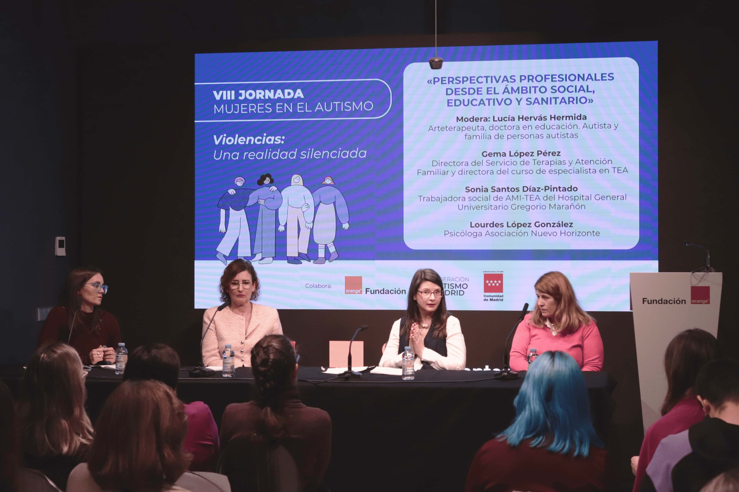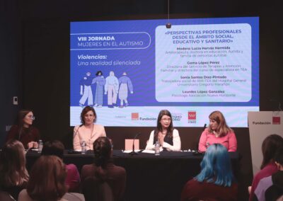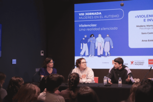 La última mesa de experiencias, «Perspectivas profesionales desde el ámbito social, educativo y sanitario», fue moderada por Lucía Hervás Hermida, arteterapeuta, doctora en educación, autista y familiar de personas autistas. En ella participaron Gema López Pérez, Sonia Santos Díaz-Pintado y Lourdes López González, quienes expusieron los desafíos que enfrentan en sus ámbitos profesionales al atender casos de violencia, sobre todo en los centros educativos, en los servicios de vivienda y en el ámbito hospitalario. Además, propusieron estrategias para sensibilizar e incentivar los buenos tratos hacia las mujeres autistas con grandes necesidades de apoyo.