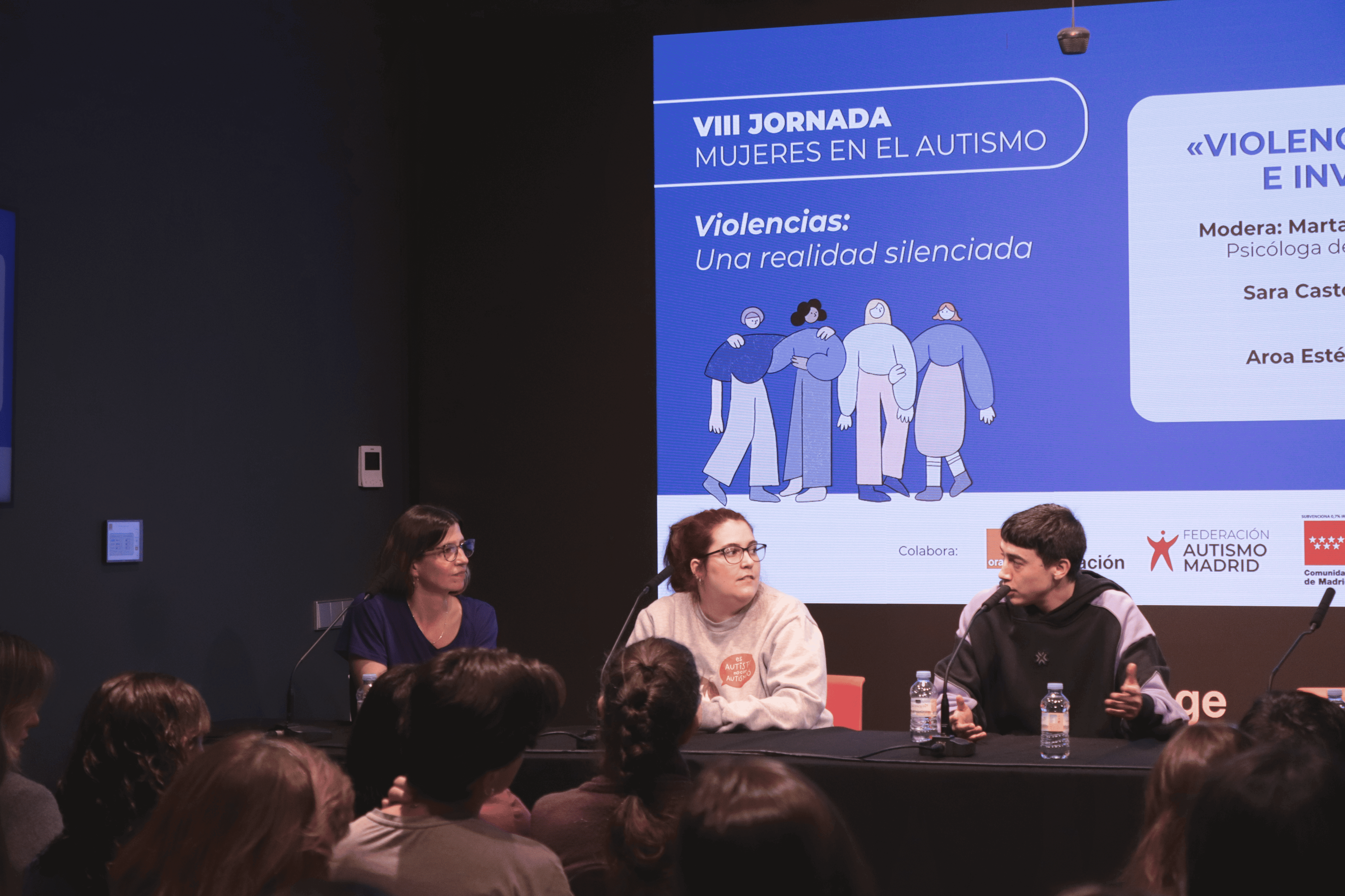A continuación, tuvo lugar la mesa de experiencias «Violencias visibles e invisibles», moderada por Marta Casanovas Mendoza y con la participación de Sara Castor Díez del Corral y Aroa Estévez García-Reyes. Durante este espacio, se compartieron testimonios sobre la violencia en el ámbito laboral, educativo, social y sanitario. Se denunció que la represión de estereotipias, la obligación de mantener contacto visual, la infantilización y la falta de credibilidad en sus testimonios son formas de violencia que afectan su bienestar.