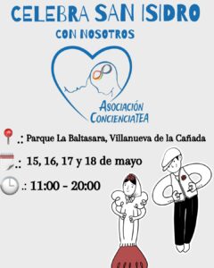 La Asociación ConcienciaTEA estará presente en las Fiestas de San Isidro 2025 con un espacio pensado para el disfrute de niños, jóvenes y familias. La cita será del 15 al 18 de mayo en el Parque de La Baltasara, en horario de 11:00 a 20:00 horas.