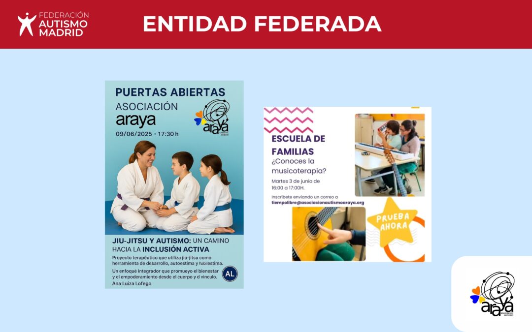 La Asociación Autismo Araya organiza dos sesiones de puertas abiertas en el mes de junio, dirigidas a familias y personas con autismo interesadas en conocer sus actividades. Próximas sesiones de puertas abiertas: Musicoterapia – Escuela de Familias...