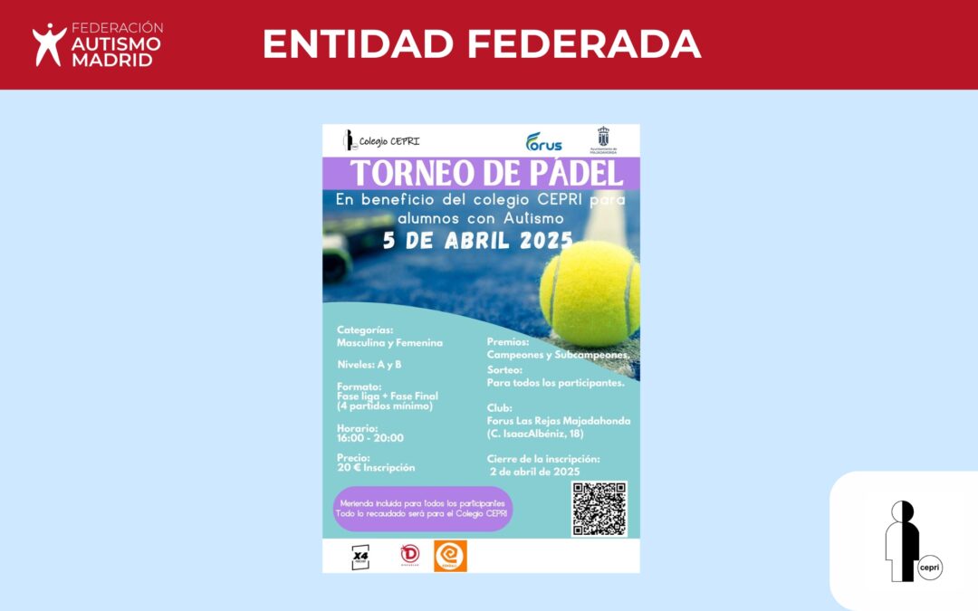 El Torneo Pádel por el Autismo Colegio CEPRI tendrá lugar el próximo sábado 5 de abril en el centro deportivo Forus de Majadahonda. Categorías: masculina y femenina. Niveles: A y B. Formato: fase liga más fase final (4 partidos mínimo). Día y horario: sábado 5...