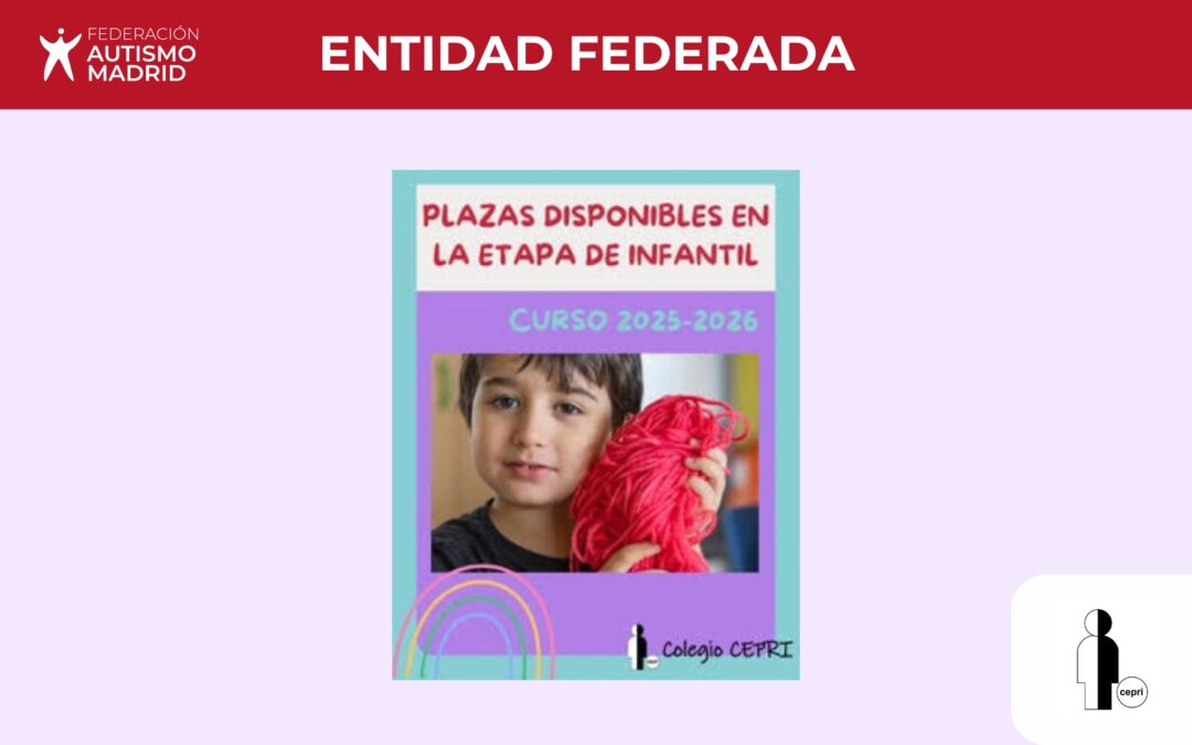 El Colegio CEPRI cuenta con plazas disponibles para la etapa de Educación Infantil en el curso 2025-2026 para niños y niñas con autismo. Etapa: Educación Infantil. Curso: 2025-2026. Entorno educativo especializado y comprometido con la atención a personas con TEA....